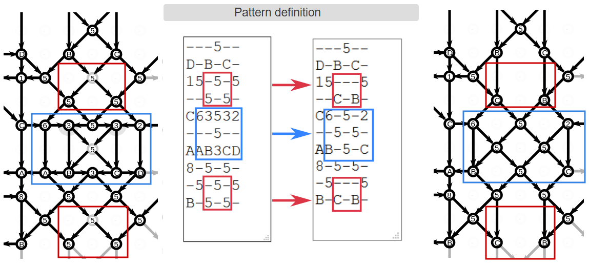 Dropping stitches using ‘-‘ can have unexpected results. For a safer alternative you can follow the link to the pattern definition. Note that this page has its own (overlapping) set of help links. Figure 3 shows snippets of that page. In these snippets, the blue edits remove the middle stitch for variation 2. The red edits remove the top and bottom stitches for variation 3. Dropping the middle stitch causes a W shape in figure2, the blue edit gives a more familiar position of the remaining stitches. For variation 4 you can choose to remove the middle stitch and add twists to the adjacent cloth stitches, or apply just a twist to the middle stitch.