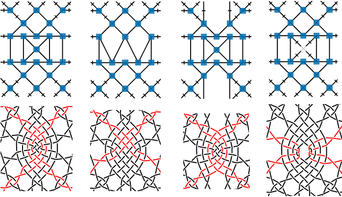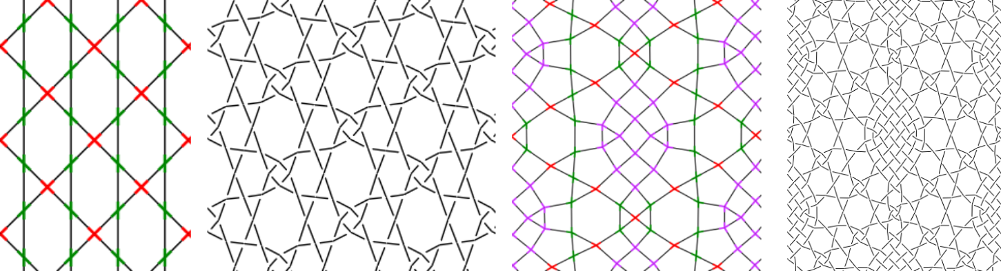 Below are four main variations showing the pair diagram coded with 4 colors per stitch (top row) and the corresponding thread diagram (bottom row).