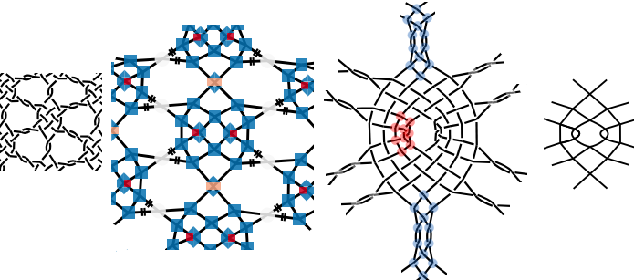 The following example follows the transformation from a thread diagram used as pair diagram to thread diagram, a Droste effect. The last diagram is a traditional pair diagram for the eyed spider. In the step from thread to pair diagram the double twists are reduced to a single stitch because everything done with just two pairs is a single stitch in GroundForge. The same would apply to a doubled cross. The second thread diagram highlights a Brussels stitch with a blue color. It creates a cloth stitch at the end of ona spider and another cloth stitch at the beginning of the next spider and two twisted legs in between. The other legs are crossed in the GroundForge pair diagram but by applying just twists to that stitch we get parallel twisted legs. The red highlights represent a single stitch in the GroundForge pair diagram while it represents two stitches in the traditional pair diagram for an eyed spider.