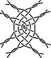 The first example is a traditional spider. Note that leading/trailing twists in the initial stitch cause crossed legs in the pair diagram of the first droste step. Assigning just twists to these stitches nicely separates the legs into twisted pairs. Due to the nature of the droste effect, that effect repeats in the second droste step.
