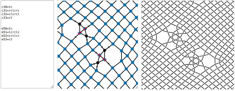 Compare the text box and thread diagram of the screenshot with the recipes. You don’t need to edit the big text box, but in this case it can be easier to copy-paste the recipe and edit to get something like the screenshot. The start of the ID-s like c3 and e5 depend on your pattern and where you applied the plait stitches. The number of lines depend on the number of stitches in your snowflake recipe. After applying the broomstick, the lines will get reorganized and the recipe no longer recognizable.