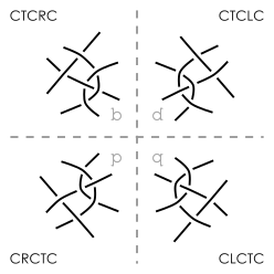 Please note: CT is represented in our list as C with a twist on both pairs between stitches. Similarly, CTC and CTCT are both represented as CTC in our list, where CTCT has a twist on each pair between stitches and CTC does not.